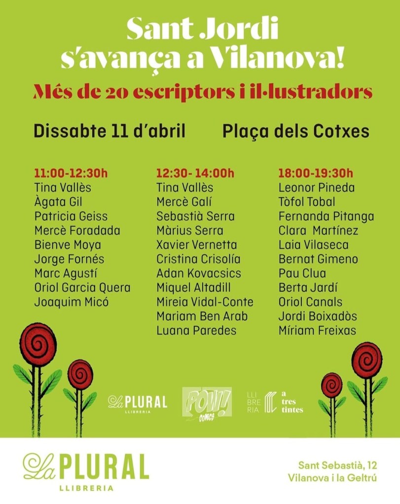 El proper dissabte 11 d’abril signaré la novel·la Cosas que no quise contarme a Vilanova i la Geltrú en un Sant Jordi avançat. Estaré a la plaça dels Cotxes a partir de les 18h amb d’altres autors i il·lustradors locals. Els que vingueu us podreu portar un punt de llibre en format targetó amb la portada del llibre. Us espero!